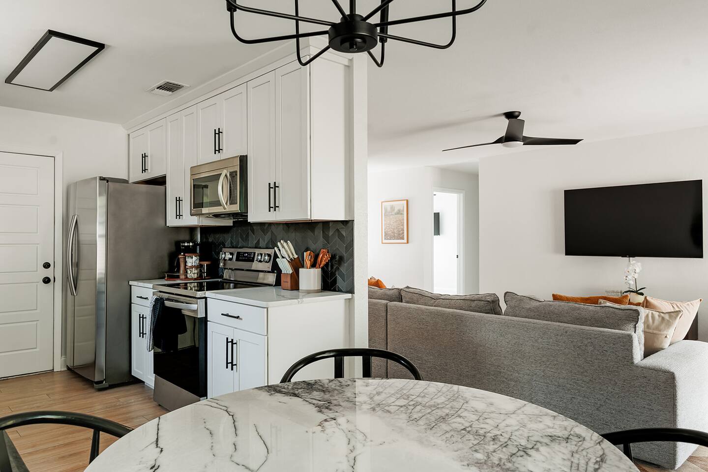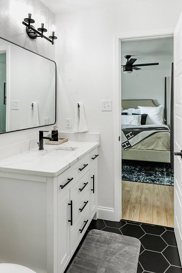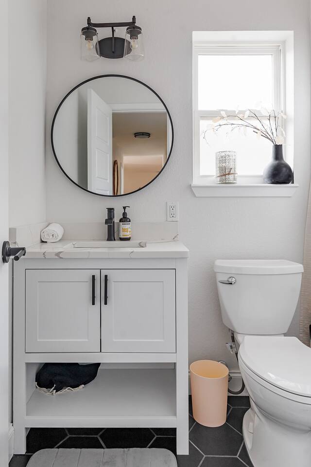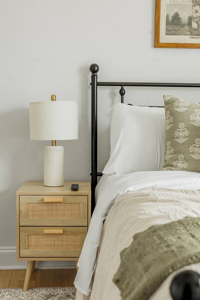 Upon entering our property, you'll discover ample parking in the large driveway or street parking for your entire group. Step inside through the front door and immerse yourself in our cozy and updated home. With thoughtful artwork, and modern decor throughout, you'll feel right at home. LIVING ROOM: As you enter the main living area, you'll find comfortable seating for 6+. Feel free to indulge in the large smart TV (bring your own login and enjoy any app!). Highlights of the living room include: ✧ Largest space in the house! ✧ Comfy and cozy seating! ✧ Large 65" smart TV! ✧ Modern luxury furniture! ✧ Plentiful throw blankets (because who doesn't like a little extra coziness!) CLÁSSIC KITCHEN: The living room leads to our updated kitchen. Our guests often enjoy preparing a home-cooked meal in this fully stocked kitchen while gathering around the island for great food, drinks, and conversation! Highlights of our kitchen include: ✧ Soap stone countertops! ✧ Stainless appliances! ✧ Coffee bar with pour over/drip machine! ✧ Creamer/sugar/filters/tea provided! Attention to Detail: ✔ Impeccable cleanliness is our top priority, ensuring you enter a sparkling clean home! ✔ For your convenience, we have an ironing board, iron, and steamer available. ✔ Each bathroom and the kitchen are equipped with a first aid kit for minor cuts and scrapes. ✔ We provide premium linens to guarantee ultimate comfort for every guest. ✔ Basic paper goods and consumables are on hand, including paper towels, tissues, toilet paper, dishwasher tablets, dish soap, and sponges. ✔ Coffee, creamer, sugar, and tea are all included. THE DINNING AREA: features a table and chairs seating 4 guests. MASTER BEDROOM: The master bedroom offers an intimate space with a king-size bed featuring a high-end memory foam mattress. Choose from firm and soft pillows for your comfort. A 42'' smart TV is also available. The attached bathroom is one of 2 bathrooms! It includes a sink and ample space for getting ready. Relax and decompress as your stress melts away in the warm shower. Highlights of the master suite include: ✧ King-size bed with luxury memory foam mattress! ✧ Walk-in shower! ✧ Premium linens provided! OTHER BEDROOMS AND BATHROOM: Bedroom 2, located in the front of the house to the right of the front door, features a memory foam queen bed, nightstands, lamps, a 40” smart TV and a closet. Bedroom 3, also on the right side of the home, includes a queen bed, nightstands, lamps, a 40” smart TV and a closet. The second full bathroom conveniently sits between bedrooms 2 and 3, featuring a shower tub combo. Beside the shower, you'll find a well-sized vanity with ample space for your morning routine. Bedrooms and bathroom highlights: ✧ Rest comfortably on 2 queen size beds with luxury memory foam mattresses! ✧ Each room boasts a fun and unique design theme! ✧ Shampoo, conditioner, body wash, and soap are all provided! ✧ Enjoy a custom tile shower for a spa-like experience! ✧ Premium linens are at your disposal! ✧ Generous closets to organize your belongings! We hope you enjoy the cozy and inviting atmosphere of each bedroom in our home. OUTDOOR SPACE: Step onto the back patio, accessible from the living room. We provide a propane grill for your outdoor cooking desires!